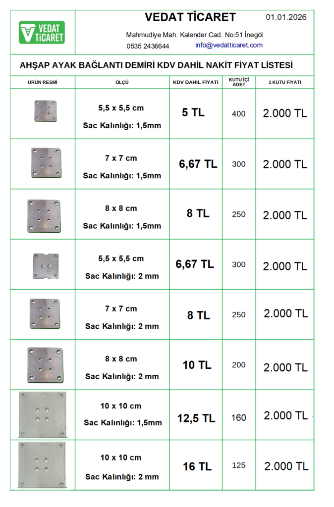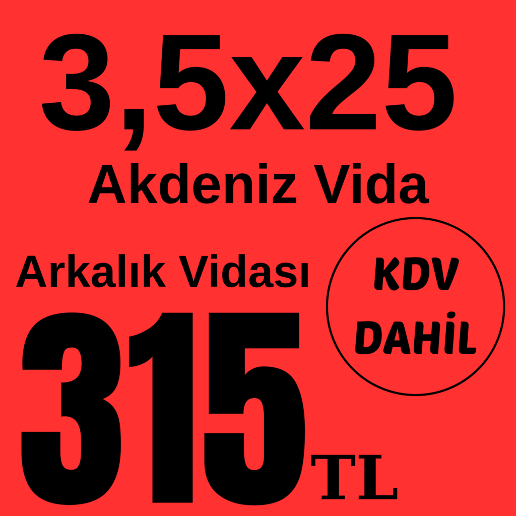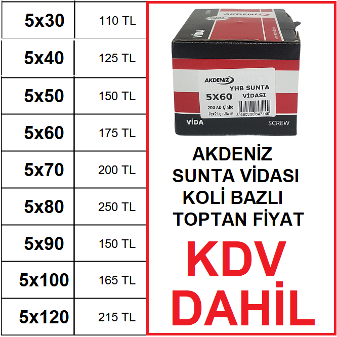 5×30 5×40 5×50 5×60 5×70 5×80 Akdeniz Sunta Vidası Toptan Satış Fiyatları – Kdv Dahil – Nakit